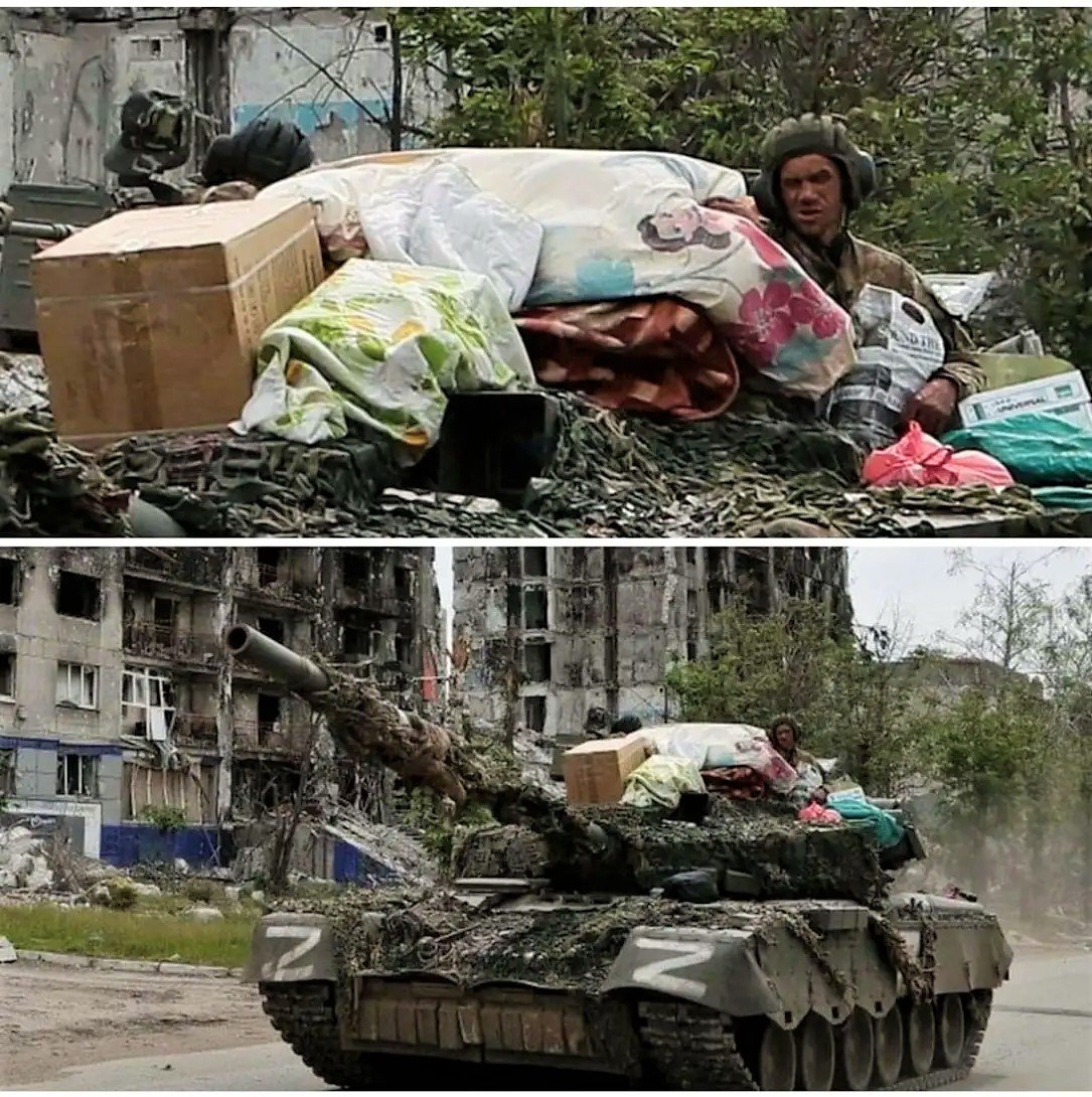 Картинка иллюстрирующая настоящее лицо русского мира. Мерзкая рожа на танке, которая спёрла детские простыни. Кстати, владелица после того, как фото разнеслось по Инету опознала свои вещи.