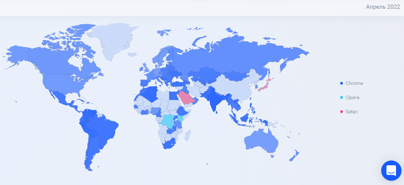 Цветом показано какой браузер преобладает, а насыщенностью - насколько. По ссылке карта интерактивная, можно мышку навести и узнать. Ну а по светло-голубым областям (типа Китая или Гренландии) вообще данных нет.