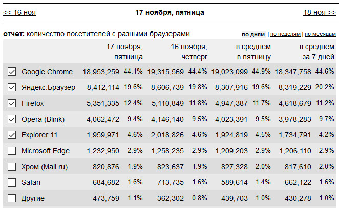 Посмотрел статистику за пятницу по примерно 20% российских сайтов. Chrome-то и правда прет по-черному - больше 50 процентов. А у Firefox - менее 5 процентов. Но интересно было бы посмотреть статистику по десктопам, потому что такое количество Chrome явно связано с тем, что почти на всех андроидных телефонах стоит Chrome, а доля мобильного трафика сейчас, насколько я помню, в районе 70%. Если кто-то знает, как найти статистику только по десктопам - был бы очень благодарен.