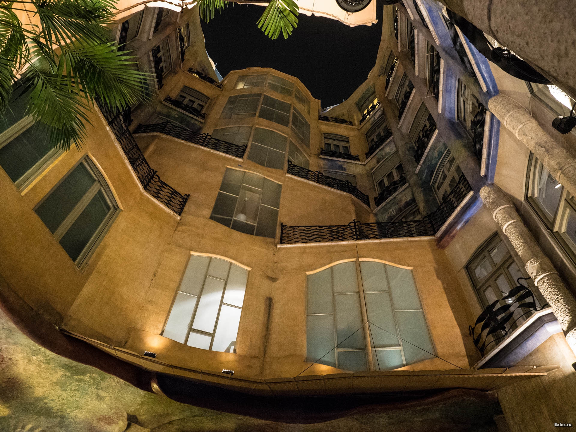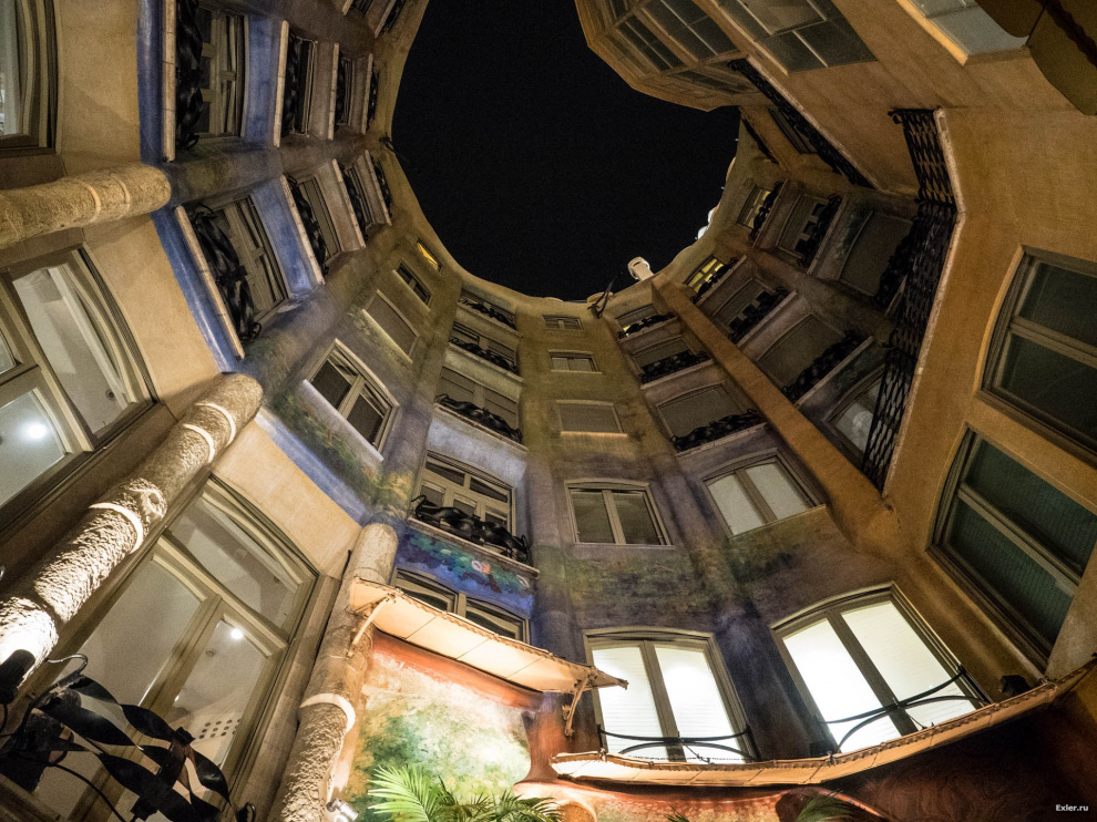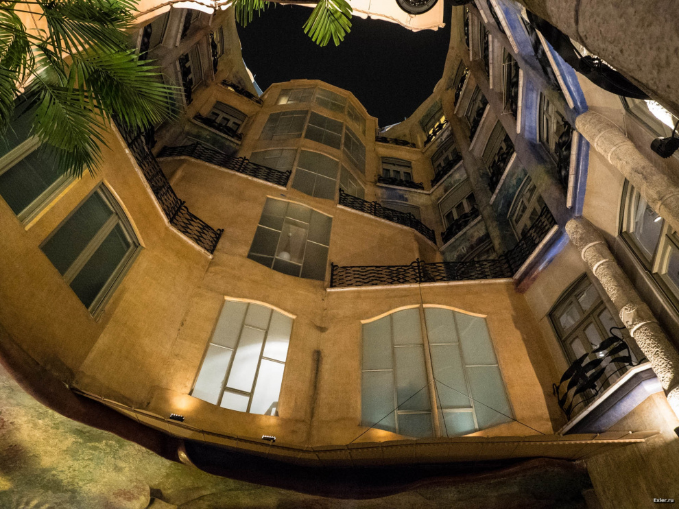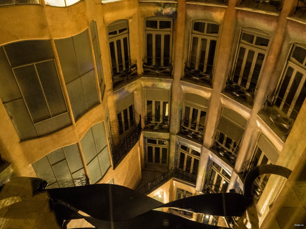 Заходим внутрь - и видим традиционное для Гауди решение: большой внутренний двор-колодец, с помощью которого внутренние помещения хорошо освещаются в течение дня.