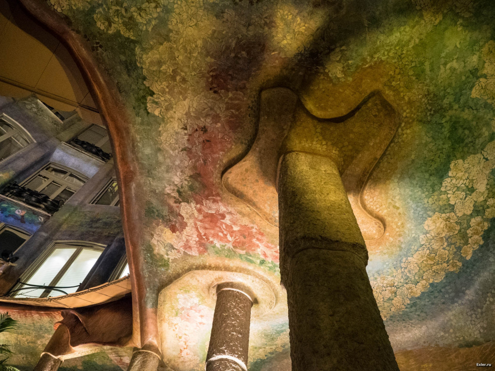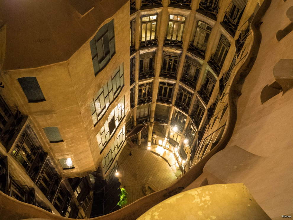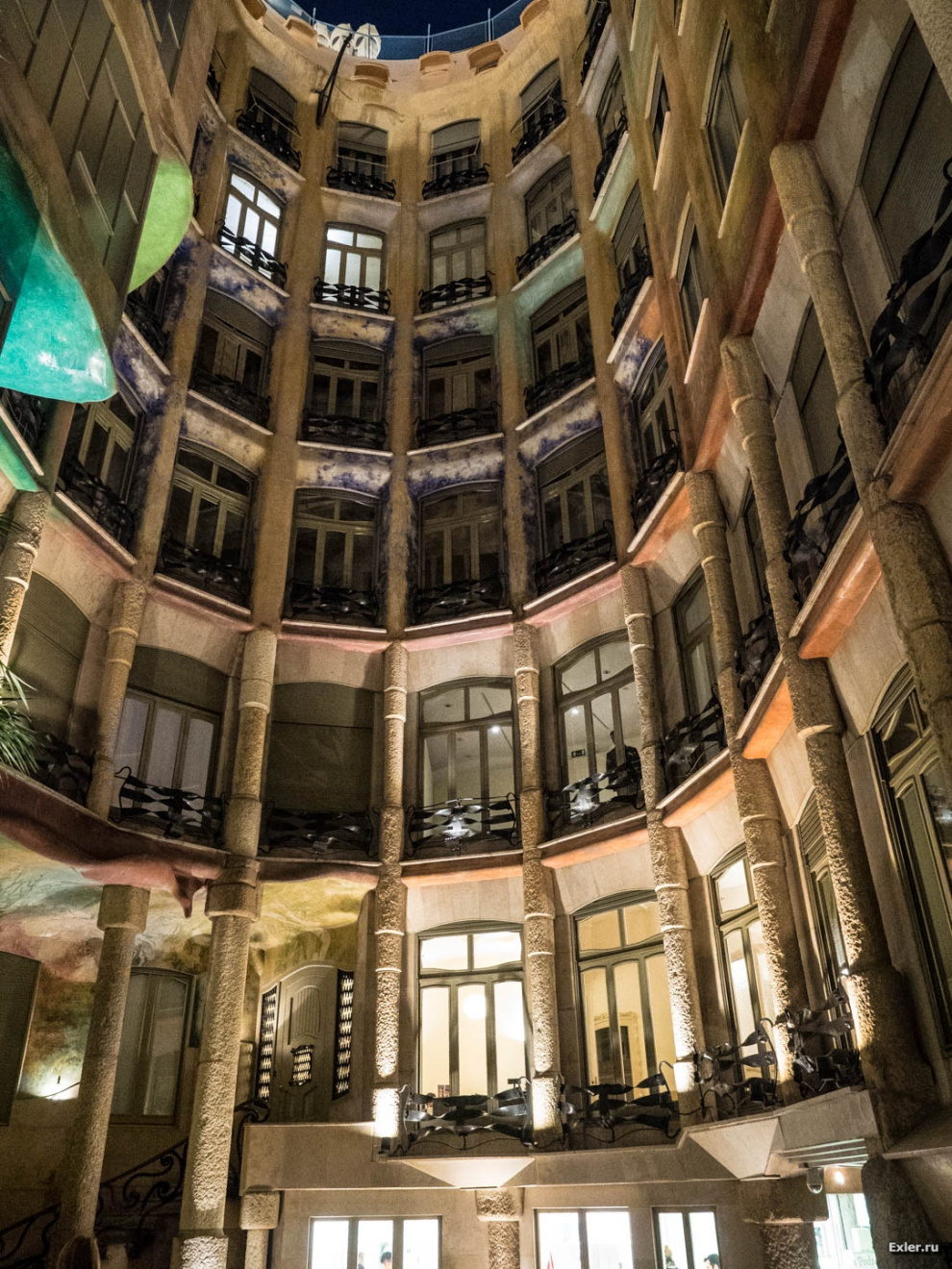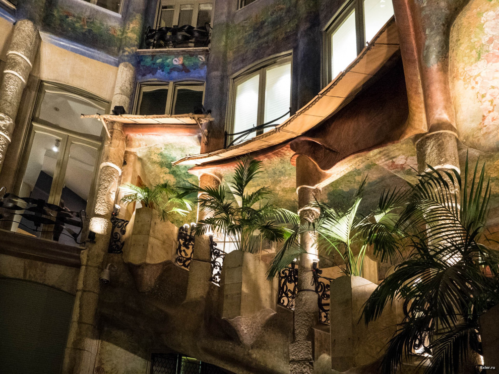 Заходим внутрь - и видим традиционное для Гауди решение: большой внутренний двор-колодец, с помощью которого внутренние помещения хорошо освещаются в течение дня.