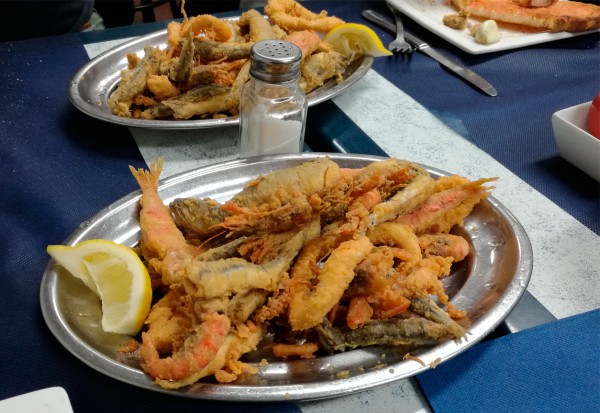 Все это - самый что ни на есть свежак: хозяин ресторана в 6 вечера идет на рыбную биржу и покупает только что выловленные морепродукты. В 8 вечера все это, обжаренное в легком кляре, стояло у нас на столе. Очень вкусно. Впрочем, с таверной "Геркулес", что в деревне Зиги на Кипре, это, конечно, не сравнить ни разу, но по морепродуктам круче "Геркулеса" я вообще ничего не встречал: готов только из-за нее еще раз на Кипр слетать.