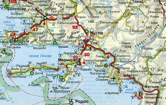 Взяли машину напрокат, с утра выехали. На Бодрум рванули самой быстрой дорогой - через Муглу. Я, как обычно, ехал довольно быстро - где-то 150, помня о том, что все предыдущие разы полис меня не трогал. Ну и наконец-то нарвался - на одном из равнинных перегонов полис засек меня своим радаром (надо сказать, что предупреждение о радаре там висело, я просто не обратил на него внимания), передал следующему - и тот меня тормознул за превышение.