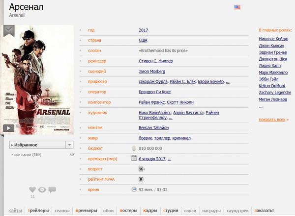 Новый фильм "Арсенал". В главных ролях - Николас Кейдж и Джон Кьюсак. От режиссера, который до этого выпускал только низкосортный шлак: самый высокий рейтинг у его фильма - 5,8. Самый низкий - 4,0. Что интересно, в предыдущем шлаке этого режиссера под названием "Налетчики" снялся Брюс Уиллис.