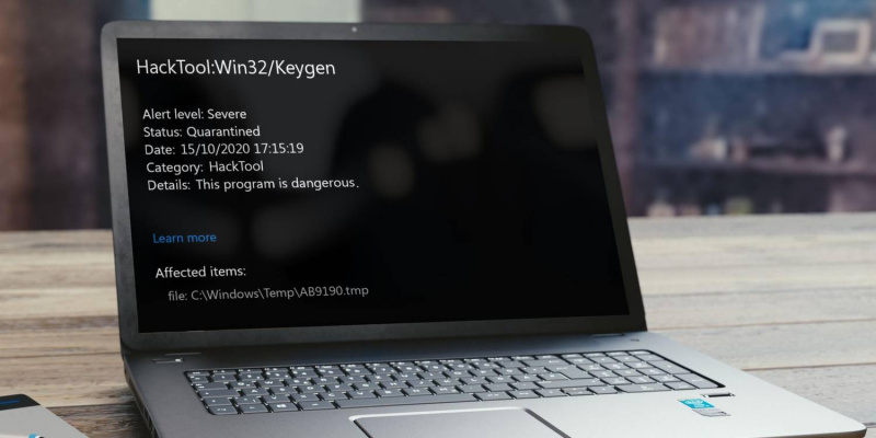 Ноутбук, демонстрирующий вредоносную программу HackTool:Win32/Keygen в истории защиты Windows Defender