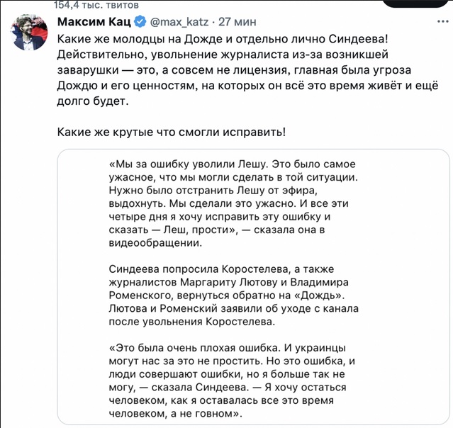 3) Фраза Коростелева - его уволили, извинились и пояснили, что это не совпадает с политикой и мнением канала, чего имхо более чем достаточно.