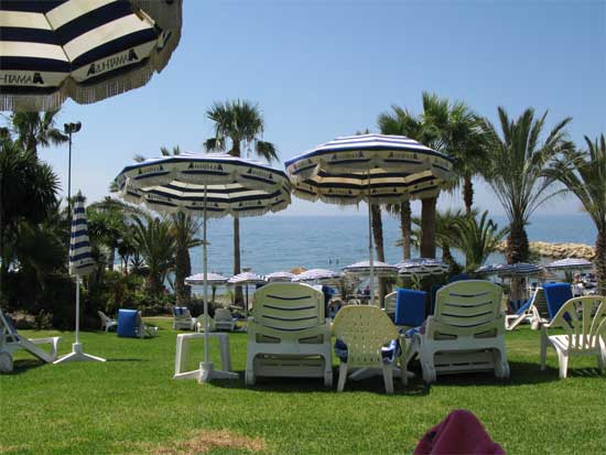 А вот вид со стороны шезлонгов - на полянку и пляж с морем. Море, кстати, теплое, мы вовсю купаемся.