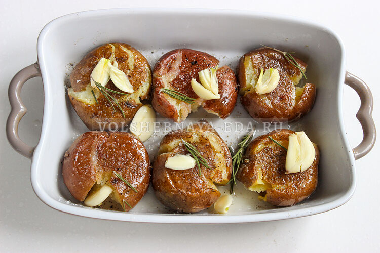 Когда картошка была готова, у каждой картофелины сверху снимается кожура, после чего мякоть картошки разминается вилкой, щедро сдабривается подготовленным соусом, далее картофелина кладется на "блюдечко" из фольги и помещается на противень.