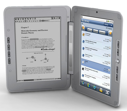 Слева - ридер на электронной бумаге с сенсорным экраном. Справа - что-то вроде интернет-планшета: почта, браузер и другие приложения. Экран - 9,7". Стоит на удивление недорого - $500.
