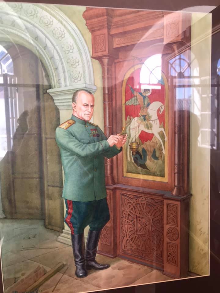 Маршал Жуков фотографирует смартфоном с внешней вспышкой икону имени себя. Холст, масло, ладан, Жуков.