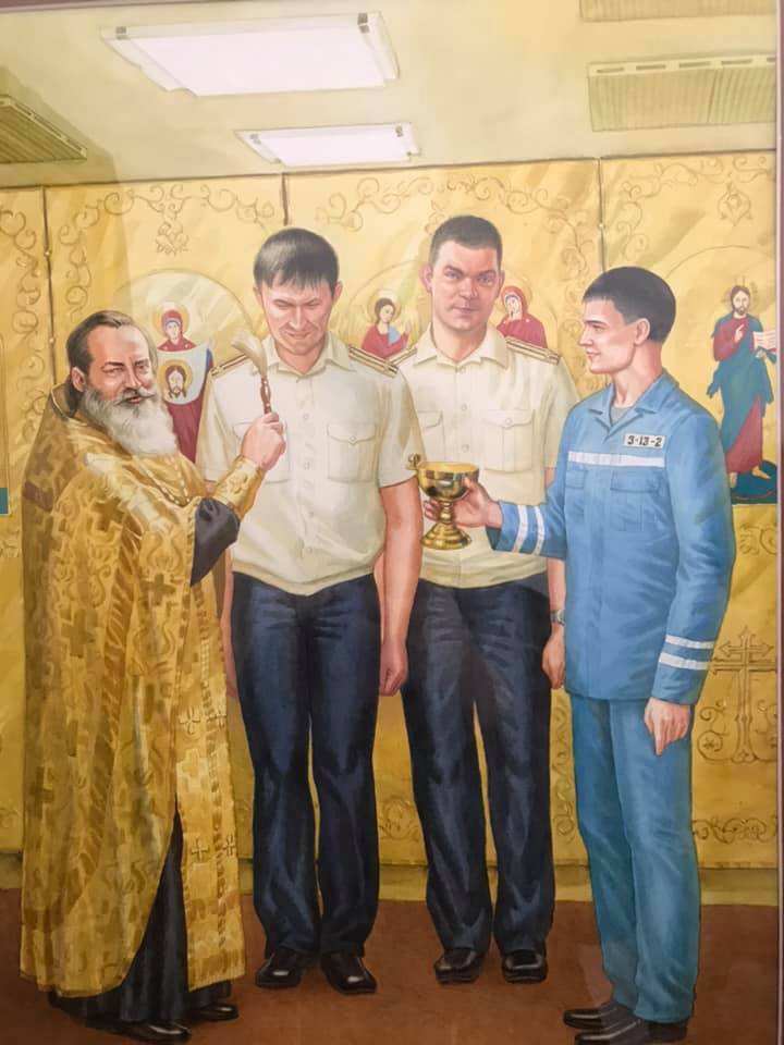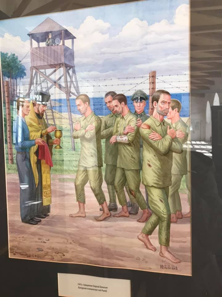 Вот это особенно чудесное. Православный батюшка окормляет военнопленных в немецко-фашистском концентрационном лагере. Интересно, что курил этот прекрасный художник?