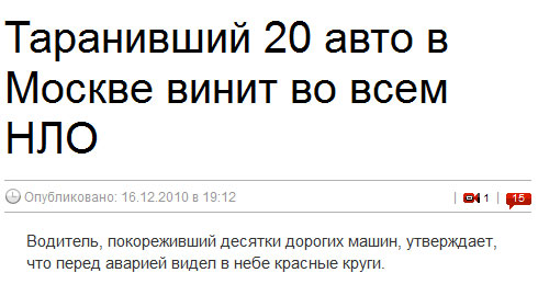 Ну увидел НЛО, с кем не бывает. А таранить машины зачем? Решил позабавиться перед концом света? Так это оттягчающее обстоятельство, явный признак хулиганства. Фанатзия совсем не работает, нет чтобы: стресс; резкая боль в сердце; потемнело в глазах из-за переутомления; крыса выскочила, напугала. Да что угодно можно придумать, зачем под дебила то косить?)