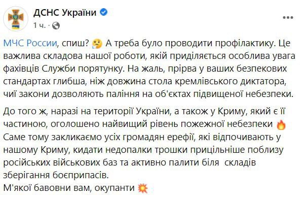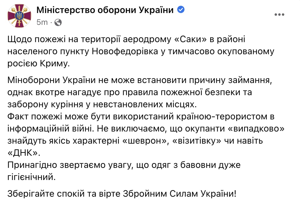Министерство обороны Украины 5m. О пожаре на территории аэродрома «Саки» в районе населенного пункта Новофедоровка во временно оккупированном россией Крыму. Минобороны Украины не может установить причину возгорания , однако в который раз напоминает о правилах пожарной безопасности и запрете курения в неустановленных местах . …Факт пожара может быть использован страной-террористом в информационной войне. Не исключаем , что оккупанты « случайно » найдут какие - то характерные « шеврон » , « визитку » или даже « ДНК » . Примечательно обращаем внимание, что одежда из хлопка очень гигиеническая. Сохраняйте спокойствие и верьте Вооруженным Силам Украины!