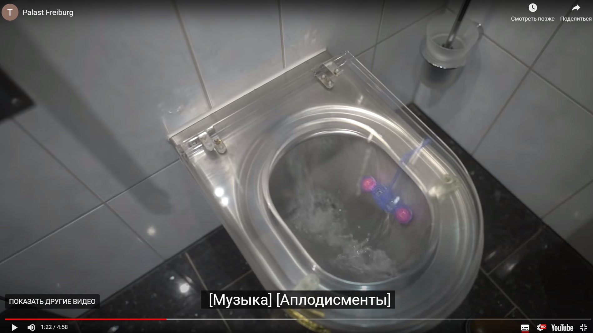 Были включены авто-генерируемые субтитры (CC), на звуке смывания унитаза (к сожалению, уже на черном экране, не сделать скриншот) высвечивается надпись [Applause].