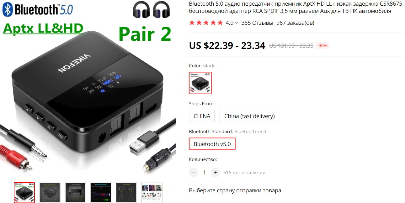 Алекс. Советую обратить внимание на фирму TaoTronics на Амазоне. Блютус 5.0 Две пары наушников без проблем.Оптический вход. Переключатель на трансмитер или ресивер.Компания выпускает неплохие вещи.