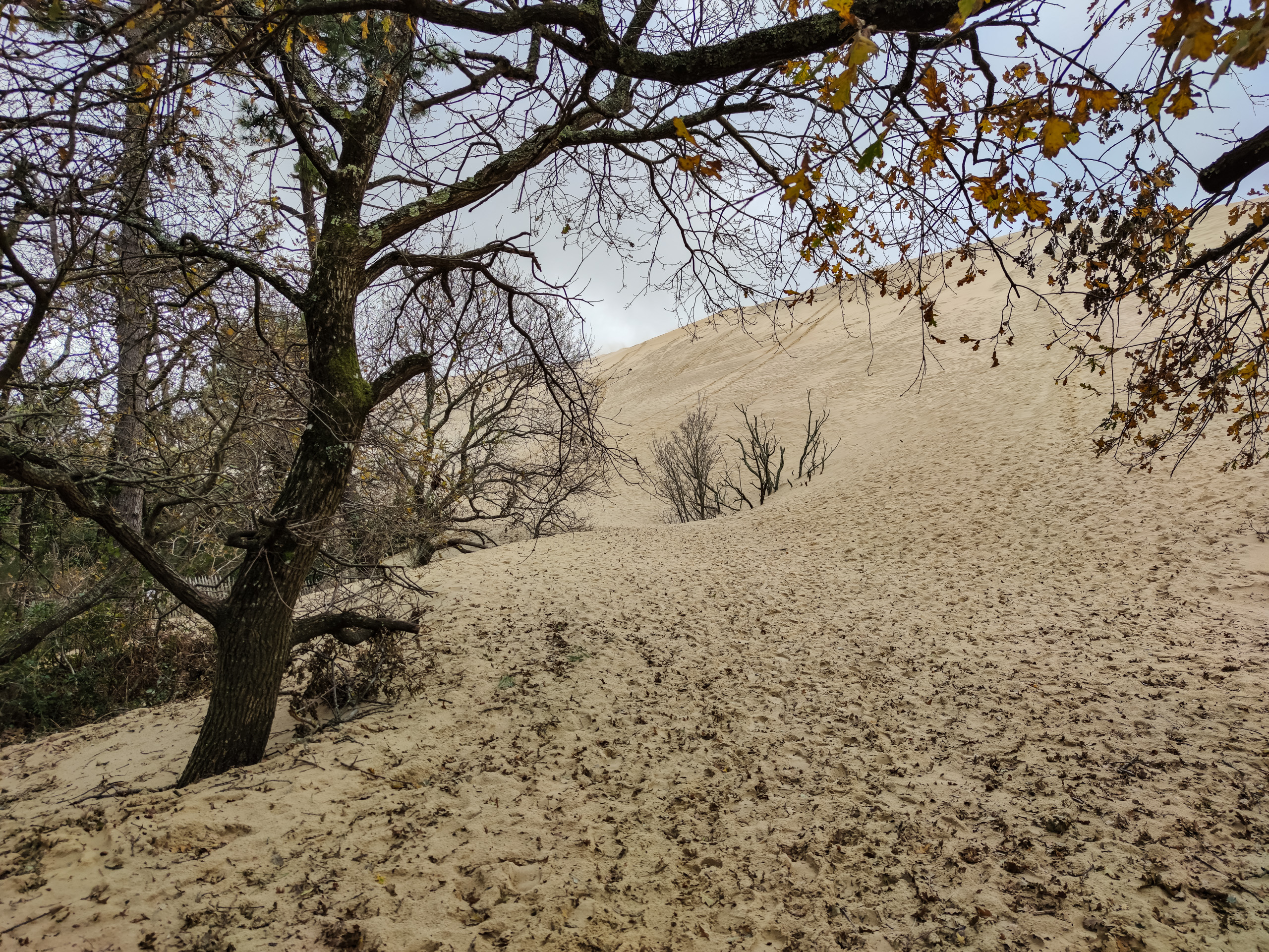 Вот это мы уже подошли к дюне. Видите по центру кадра верхушку засыпанного дерева? Так вот, несколько лет назад под этим деревом стояла кафешка. Можете себе представить, с какой скоростью дюна наступает.