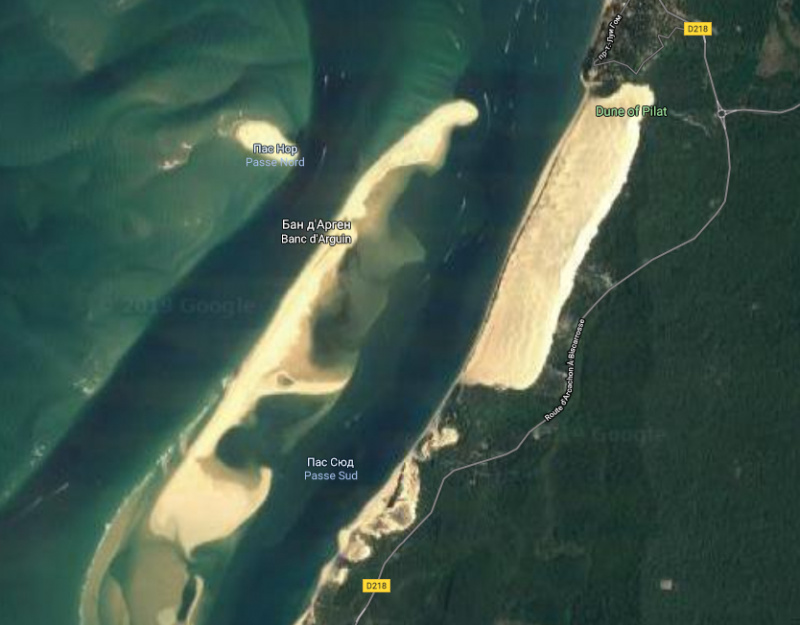 Это самая высокая дюна в Европе, ее постоянно меняющаяся высота - от 110 до 130 метров. Со спутника дюна выглядит вот так.