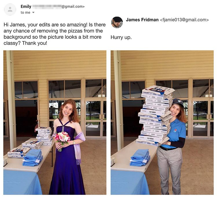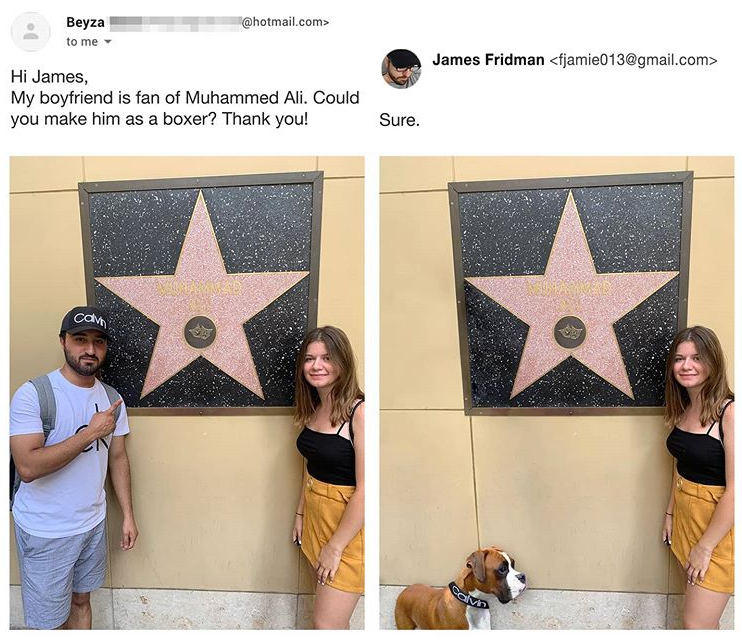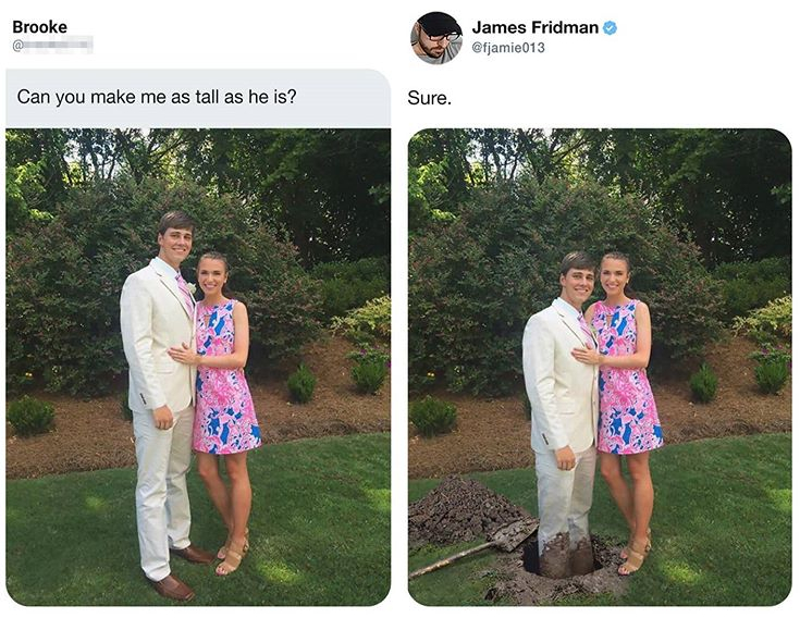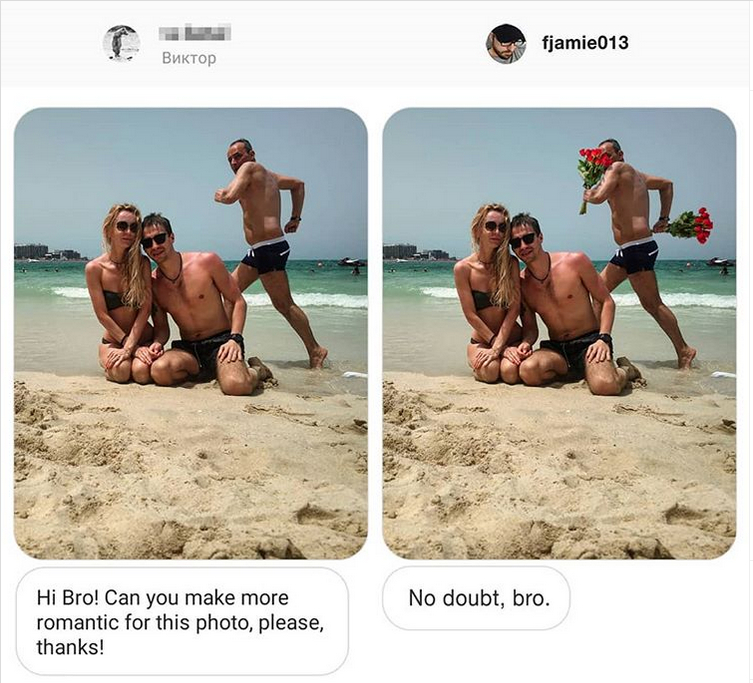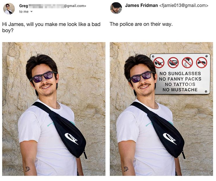 Есть такой британский графический дизайнер Джеймс Фридман. В своем Твиттере и Инстаграме он принимает заказы сделать какие-то исправления в присланных фото - и выполняет это с неизменным блеском. Занимается этим он уже довольно давно, в Инстаграме у него уже более 2,1 миллиона подписчиков. Я вчера по ссылке в его Инстаграм зашел, залип надолго, это очень забавно.