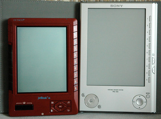 Сразу две новеньких электронных книжечки ждут тестирования. Sony Book Reader PRS-505 приехал уже давно, просто руки до него не доходили. А вот JetBook от Ectaco приехал только что. Sony 505 очень порадовал дизайном - живьем машинка смотрится на порядок лучше, чем на фото: она теперь полностью алюминиевая. Правда, при этом заметно потяжелела. А вот JetBook интересен тем, что он меньше по размеру, экран - фактически чистый покетбук.