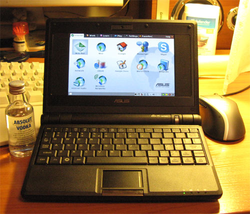 Приехал Eee PC на тестирование. Самый простой - без винта и на Линуксе. Но мне именно его и было интереснее всего потестить. Через пару недель будет статья с обзором.