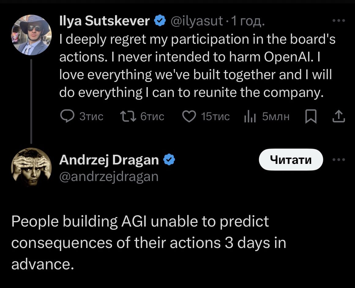 Вот реально - это как луч света из какого-то иного мира. Будто и нет двух войн, каждая из которых готова перерасти в мировую. Вот правда хочется проснуться в мире, где история ОпенАИ самая тревожная новость дня!