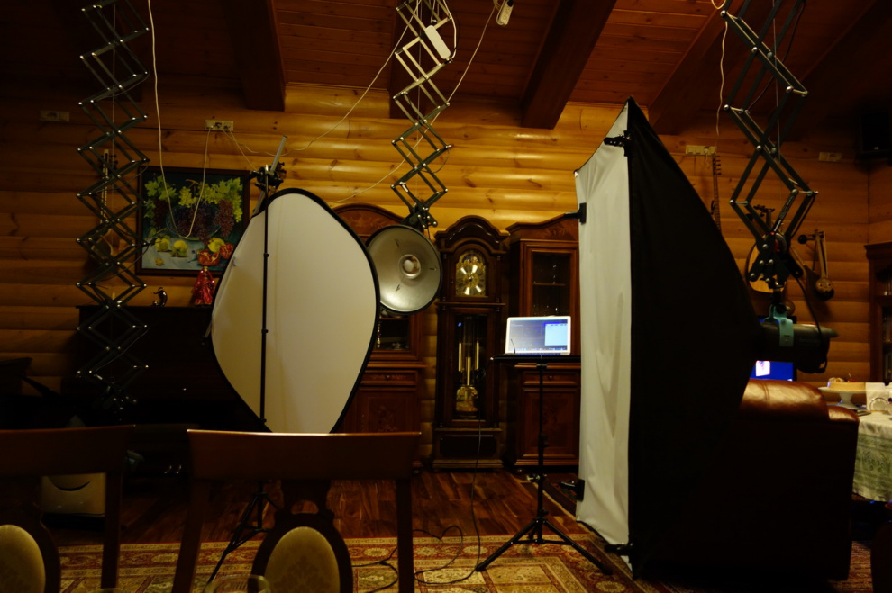 А для съемки портретов над экраном домашнего кинотеатра висят три задника различных цветов: белый, серый и черный, на которые можно светить через цветные фильтры.