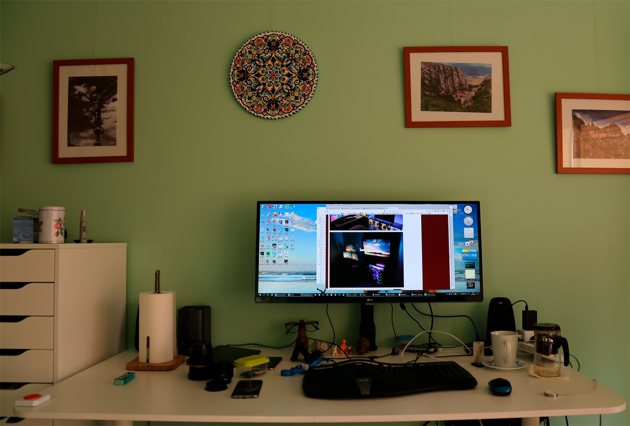 У каждого рабочее место по-своему прикольное. Но не каждый готов предъявить. Я, например, стестняюсь. Вот уберусь (году этак в 19-м) и презентую...