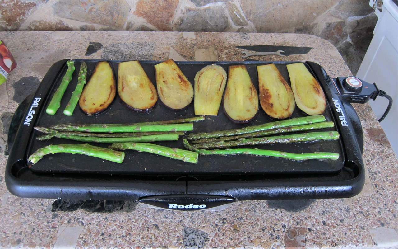 Оказалось, что штука - совершенно гениальная. На ней отлично жарятся нетолстые куски мяса (баранина, свинина, куриные крылышки), креветки, а главное - овощи. С овощами - просто класс! Я на ней делаю баклажаны, перцы, лук, спаржу. И тут главное - обязательно налить немного масла, потому что овощи без масла получаются очень сухими. Масло (я использую оливковое) их улучшает просто на порядок. Ну и надо найти нужный температурный режим, чтобы баклажаны поджарились до слегка хрустящего состояния - так они вкусне всего, потому что иначе будут мяклые и не такие вкусные.
