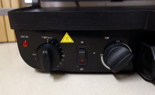 Есть снимаемый поддон для слива жира, кнопка питания (у бутербродниц ее никогда не бывает, для включения надо втыкать штепсель в розетку, а потом вытаскивать обратно для выключения, что страшно неудобно), ручка нагрева, индикатор нагрева и таймер на 15 минут.
