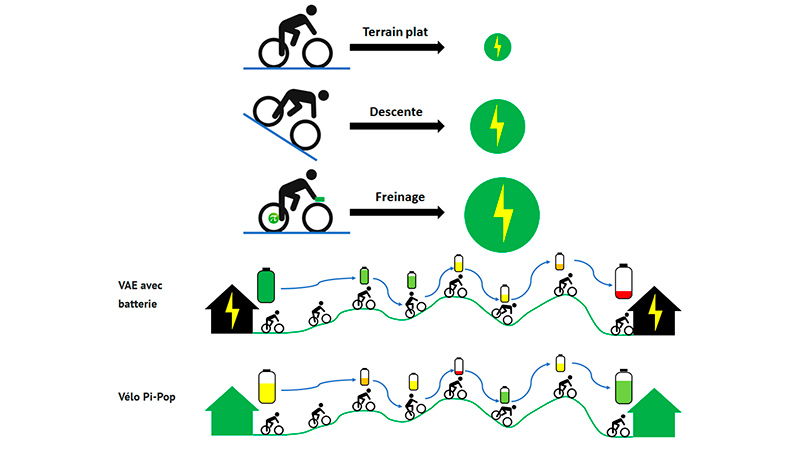 Заряд суперконденсатора велосипеда Pi-Pop происходит во время торможения, во время спуска и при движении вперед по ровной поверхности.