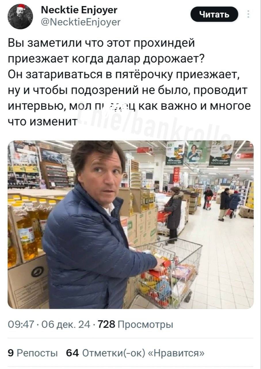 Карлсон явно напрашивается на Рождество к Трампу; а то обидно - Маск индюшку лопал на День Благодарения, какого-то майора с Фокса прочат на министра обороны, а где моя плюшка?!