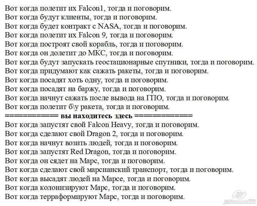 создание совершенно нового, экологически чистого электромобиля и аккумуляторов энергии - это меня неописуемо радует 😄, собирают Теслу из, грубо говоря, китайских деталей (контроллеры, движки и аккумуляторы 18650) троллейбусов и выдают за инновацию. А для пилотируемых запусков в космос ключевой характеристикой является надежность, летаем мы в космос сравнительно недавно, какой-то методики проектирования космолетов не существует, приходится строить их методом проб и ошибок, поэтому определяющей характеристикой запуска фальконов будет повторяемость результатов. Иначе космонавны в них не сядут 😄