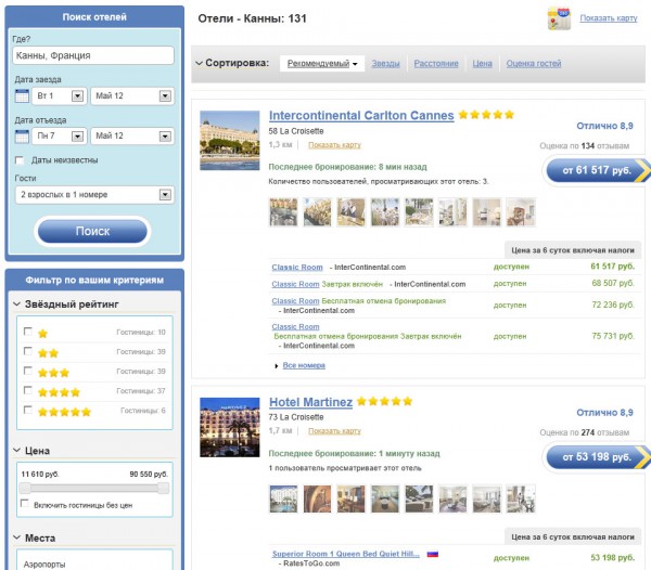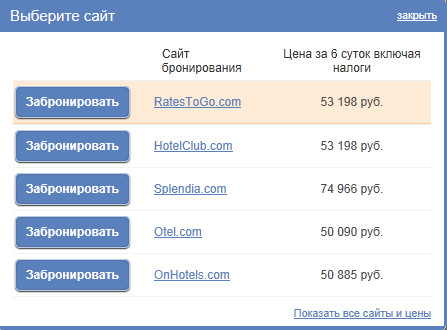 Нажимаете кнопку "Сравнить цены". Вам выдают список найденных отелей с примерными ценами, и этот список вы можете как угодно сортировать, менять критерии отбора, задавать нужные виды услуг и так далее. Самое интересное тут заключается в том, что цены порой значительно отличаются у каждой системы бронирования.