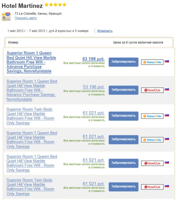 Выбираем, например, Hotel Martinez - я как раз недавно жил, отличный отель. Нажимаем на кнопку с ценами - получаем список предложений по различным системам. Обратите внимание на то, что среди наиболее интересных предложений нет Booking.com - такое бывает нередко. Потому что у него не всегда - лучшие предложения, так что ценность ePronto - очевидна: у вас заметно больший выбор, и вы не упустите самое заманчивое предложение.