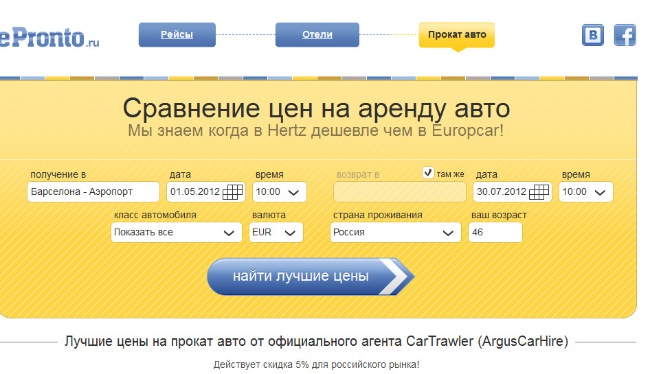 Кроме скидок на отели, ePronto ищет минимальные цены на прокат авто.
