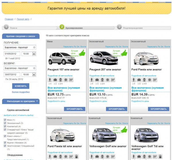 После этого вам выдадут лучшие предложения с минимальными ценами на аренду автомобиля. При этом вы можете задавать различные дополнительные опции (например, вид трансмисии, вид топлива), отбирать автомобили по классу. Ну как выберете, далее остается только нажать кнопку "Забронировать". Небольшая часть аренды оплачивается сразу, остальное платится незадолго до поездки (обычно за неделю) или непосредственно при получении автомобиля.