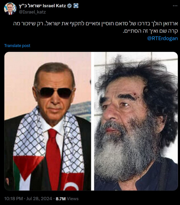 Министр иностранных дел Израиля Исраэль Кац в ответ на это заявил в Твиттере, что Эрдоган, угрожая атаковать Израиль, "идет по стопам Саддама Хусейна".
