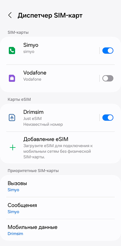 В моем смартфоне Samsung Galaxy S23 Ultra поддерживаются две симкарты, также туда можно установить несколько (вроде бы до 7) eSIM, электронных симкарт. Одновременно там могут работать только две карты - две симки или одна симка и одна eSIM. И это очень удобно: загрузил, например, eSIM для поездок, в поездке отключил вторую ненужную в дороге симку и подключил eSIM для поездок, оставив включенным основной номер - отличная возможность.