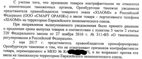 На скриншоте написано, что теперь таможня, не обладающая компетенцией, чтобы самостоятельно отличать контрафакт (подделку) от оригинала, будет по каждой посылке с Сяоми внутри спрашивать совета у Оранж, и что по ранее направленному запросу с замазанным трекинг-номером Оранж никаких возражений не имеет и разрешил его впустить в РФ.