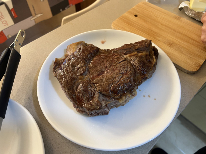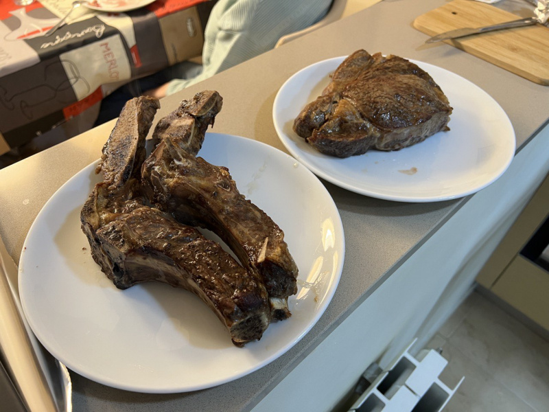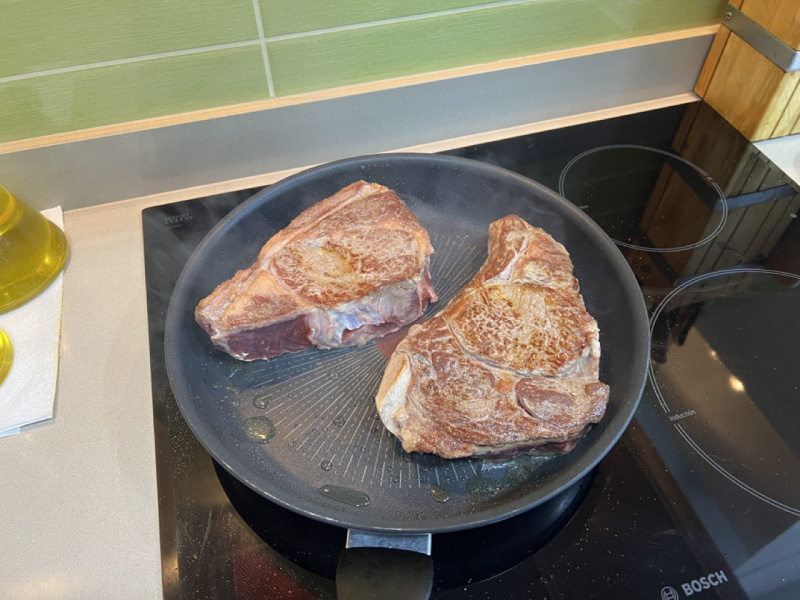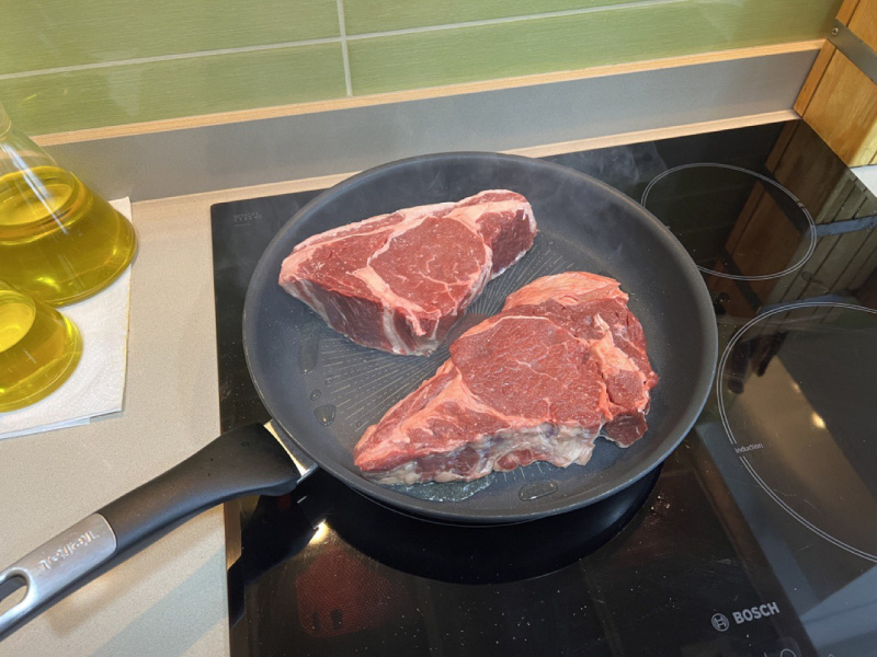 В итоге: корочки нет, мясо не поджаривается/запечатывается, а, как будто, подтушивается. То есть, попадая в прожарку, даже близко не попадаю в качество. Сейчас научился просто жарить на нормальной сковородке с толстым дном (не надо её на 9ку ставить на огонь, максимум - 7 из 9 для рибая, а то и 6), сливочное масло + чеснок и поливаем ложкой во время прожарки.