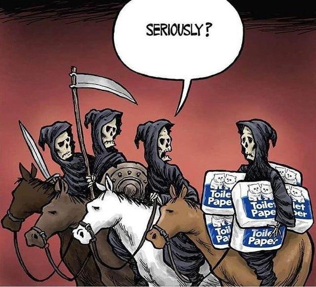 Но это мало кто понимает. Вчера в магазине наблюдал, как двое молодых людей отговаривали старушку покупать целую телегу всякой долгосрочки. "Да всё у нас нормально, не может быть, чтобы продуктов не было. По телевизору сказали - склады забиты на десять лет". Пипец.