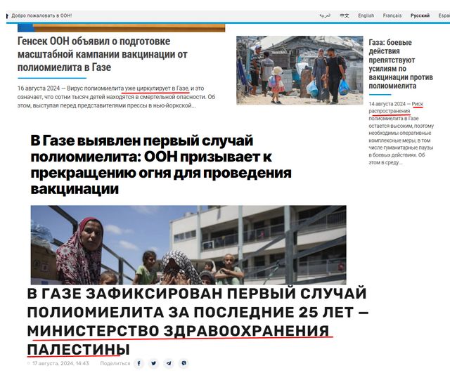 А где завывания о том, что ООН должен осудить "акт агрессии со стороны Украины"? Нет, ООН-то осудит, с этим как раз вопросов нет. Впрочем, ООНу сейчас не до лавровых-путиных. У них там "Министерство здравоохранения Палестины" (уже ржачка полнейшая) выявили в Газе первый случай полиомелита, так что теперь ООН требует от Израиля немедленно всё прекратить, чтобы ООН мог провести вакцинацию, иначе среди бойцов ХАМАСа может начаться падёж скота, а ООН это не может допустить, туда же деньги вложены гигантские. И еще выделены, надо же разворовывать!