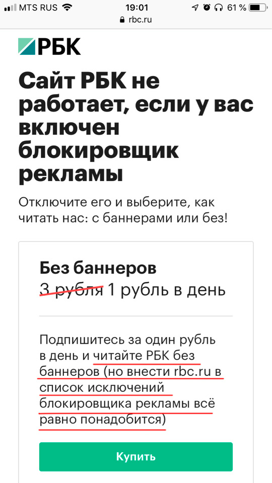 См. подчеркнутое. То есть у "РБК" настолько криворукие программисты, что они не могут отключать скрипт проверки наличия блокировщика для заплативших за отключение баннеров? Это просто пять баллов!