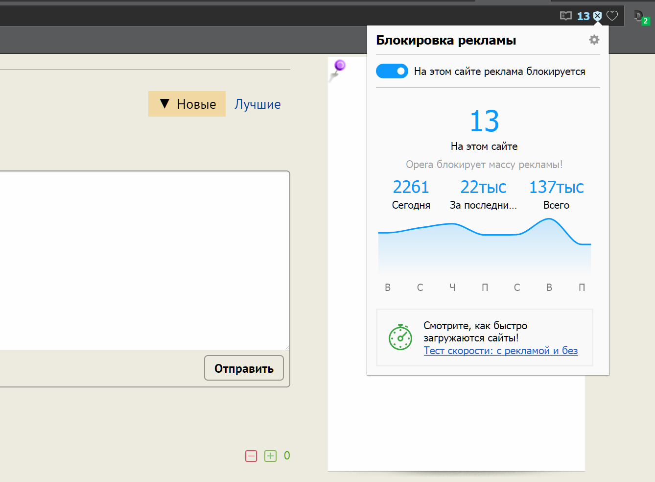 Вот как ни странно, два посещаемых мною стэнд-элон блога (exler.ru и oper.ru 😉 - всем привет!) именно в Opera дают загрузку _С_ рекламой быстрее, чем _БЕЗ_.