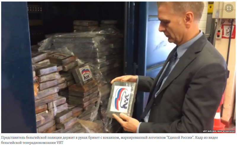В порту бельгийского города Гент полиция перехватила три контейнера с 2 тоннами кокаина, упакованного в 1903 брикета весом около 1 килограмма каждый. Брикеты с наркотиком были маркированы логотипом российской политической партии "Единая Россия".