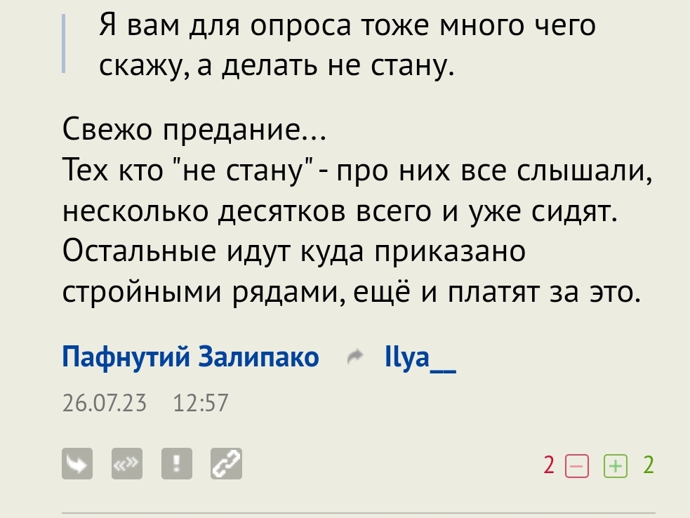Вы ответили, что таких (которые напоказ соглашаются, а на деле не поддерживают войну) несколько десятков, и они уже сидят. Остальные идут, куда приказано и так далее.