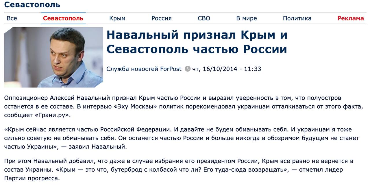 А. НАВАЛЬНЫЙ: Я считаю, что, несмотря на то, что Крым был захвачен с вопиющим нарушением всех международных норм, тем не менее реалии таковы, что Крым сейчас является частью РФ. И давайте не будем обманывать себя. И украинцам я сильно советую тоже не обманывать себя. Он останется частью России и больше никогда в обозримом будущем не станет частью Украины.