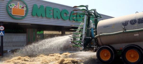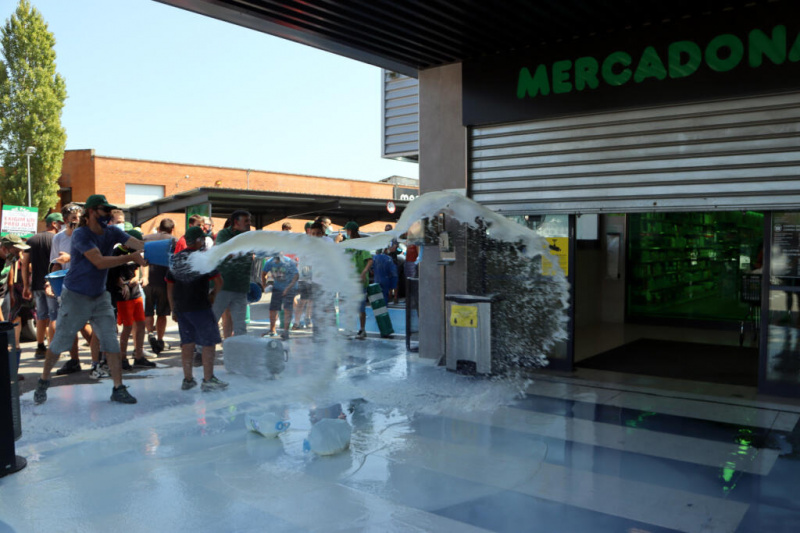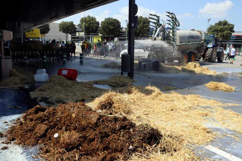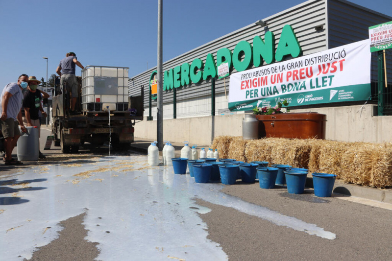 Более 150 фермеров со всей страны собрались вчера утром у ворот сетевого супермаркета "Меркадона" в городе Vic, чтобы потребовать установки справедливой закупочной цены за молоко. Это вторая мобилизация такого рода, организованная Союзом фермеров. Пятнадцать тракторов перекрыли дорогу, вход в супермаркет залили молоком, водой, закидали навозом и сеном.