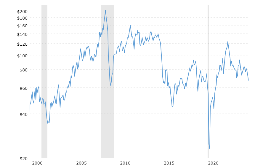 А вот цена $40 за баррель была во время эпидемии ковида. В январе 2020 нефть еще стоила $62,90 за Баррель, а к марту упала до $24,99, и восстановилась к декабрю до $58,66.