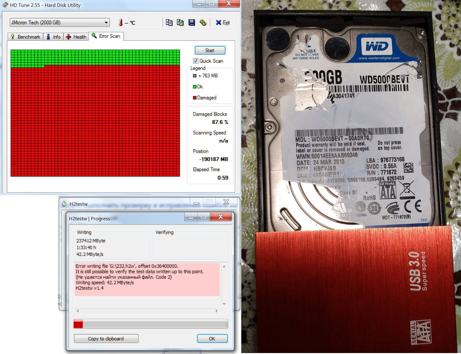 Вскрытие показало, что в качестве носителя информации был использован старый жёсткий диск 2010 года выпуска. На котором была предпринята попытка уничтожить наклейки с информацией об объёме. По остаткам наклеек было идентифицировано, что реально установленный диск - это WD на 500 ГБ. Которому перепрошивкой был занулён SMART и выставлен объём «якобы» 2ТБ. На то, что он «перепрошит» (причём криво) указывает аварийный серийный номер “WDC-ROM SN# XYZ----“. Ещё из косвенных признаков, которые указывают на меньший фактический объём диска – это тест скорости чтения, которая снижается очень резко и на 10% заявленного объёма уже достигает скорости обычно соответствующей концу диска.
